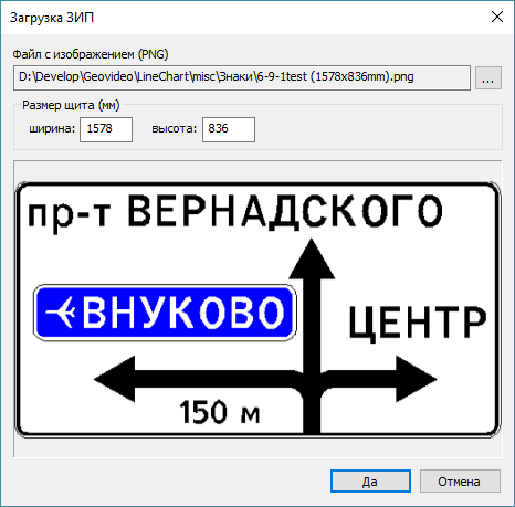 Загрузка эскиза знака 6.9.1 из внешнего файла. При загрузке следует указать реальные размеры знака в миллиметрах для правильного масштабирования на линейном графике ПОДД. Файл с эскизом знака должен быть в формате PNG. Рекомендуемый размер изображения - примерно 500 px по длинной стороне.