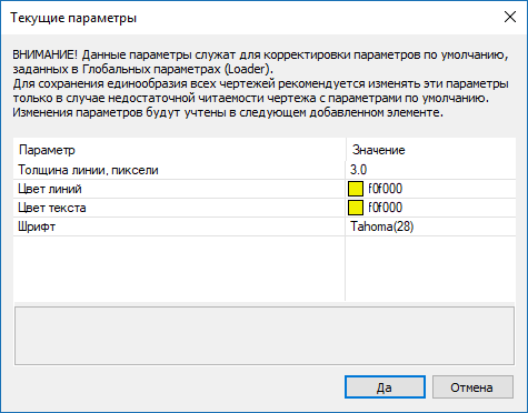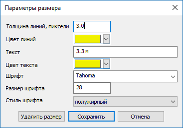Для элемента "Размер" появится диалоговое окно выбора толщины и цвета линий, редактирования текстовой подписи и параметров шрифта.